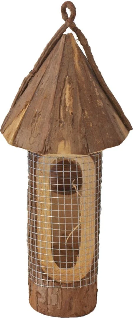 De pindahouder rond met puntdak is een leuke, natuurlijke pindahouder die voor een mooie aankleding van jouw tuin zorgt. Het is een goede voederplek voor (kleine) vogels.