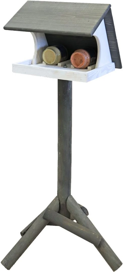 Staand voederplateau op poot met schuin houten dak en pindakaaspothouder met ruimte voor twee potten.