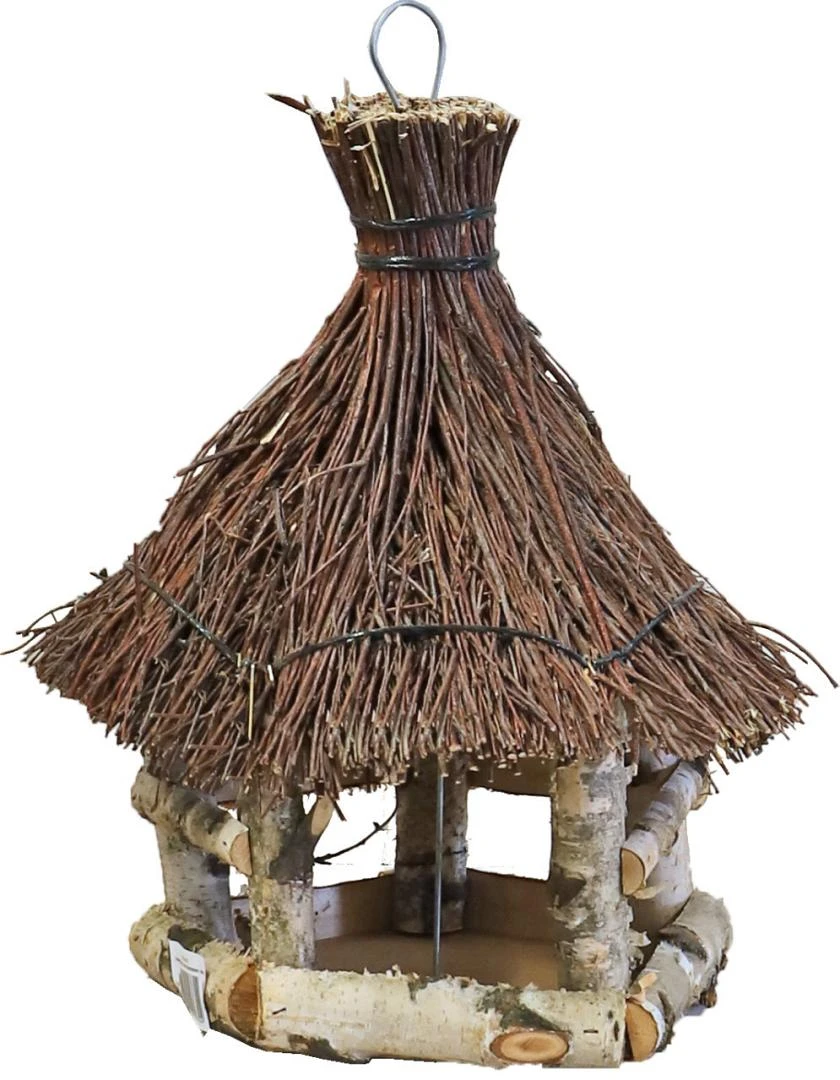 Het voederhuis zeskant berken met tenen dak is een leuk berken voederhuisje om op te hangen. Het is gemaakt van berken hout afgewerkt met een tenen dak. Op te hangen aan een metalen ophangoog.