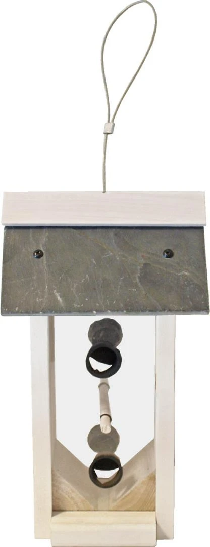 De voedersilo met puntdak is een mooie voedersilo die voor een mooie aankleding van jouw tuin zorgt. Deze witte voedersilo met een puntdak, afgewerkt met leisteen, is op te hangen aan een metalen lus. Het is een ideale voederplek voor (kleine) vogels.
