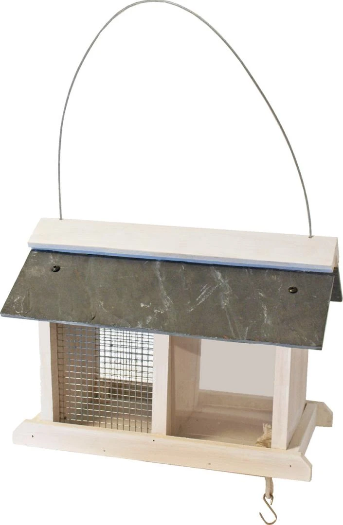 Het voederstation met puntdak is een mooi voederstation dat voor een mooie aankleding van jouw tuin zorgt. Dit voederstation heeft twee gedeeltes om zaden en pinda’s te voeren en een puntdak welke afgewerkt is met leisteen. Op te hangen aan een metalen lus. Het is een ideale voederplek voor (kleine) vogels.