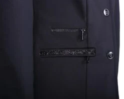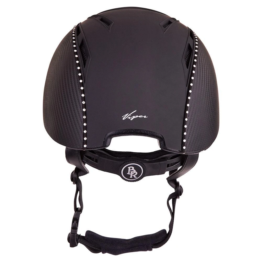De helm is aan beide zijden bekleed met Carbon. Twee zwarte biezen met Swarovski® kristallen over de gehele lengte geven de helm een luxe uitstraling. De drie fijnmazige, zilverkleurige stalen ventilatieroosters aan de voorzijde en de diverse ventilatieopeningen aan de bovenzijde zorgen voor een uitstekende ventilatie.