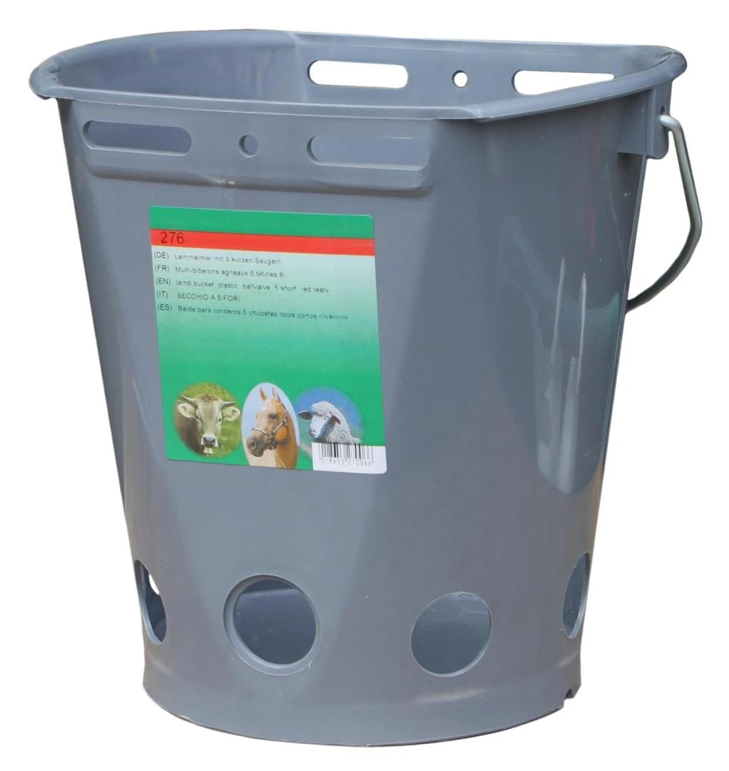 Grijze emmer tweezijdig plat met 5 grote gaten om daarin korte spenen te bevestigen.