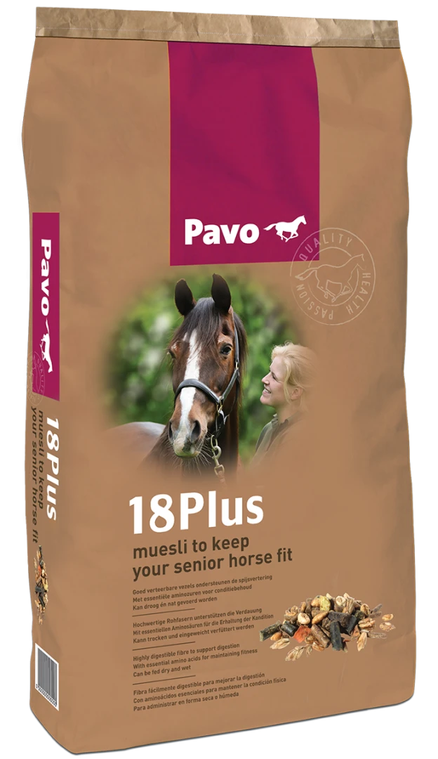 Met Pavo 18Plus verzorg je het ouder wordende paard met alles wat het lichaam vraagt zonder het systeem onnodig te belasten. Deze stofvrije muesli helpt jouw senior om vitaal en fit te blijven. Als je paard zijn ruwvoer niet meer goed kan kauwen dan is Pavo 18Plus in combinatie met Pavo SpeediBeet het complete voer voor de dagelijkse verzorging van jouw senior.