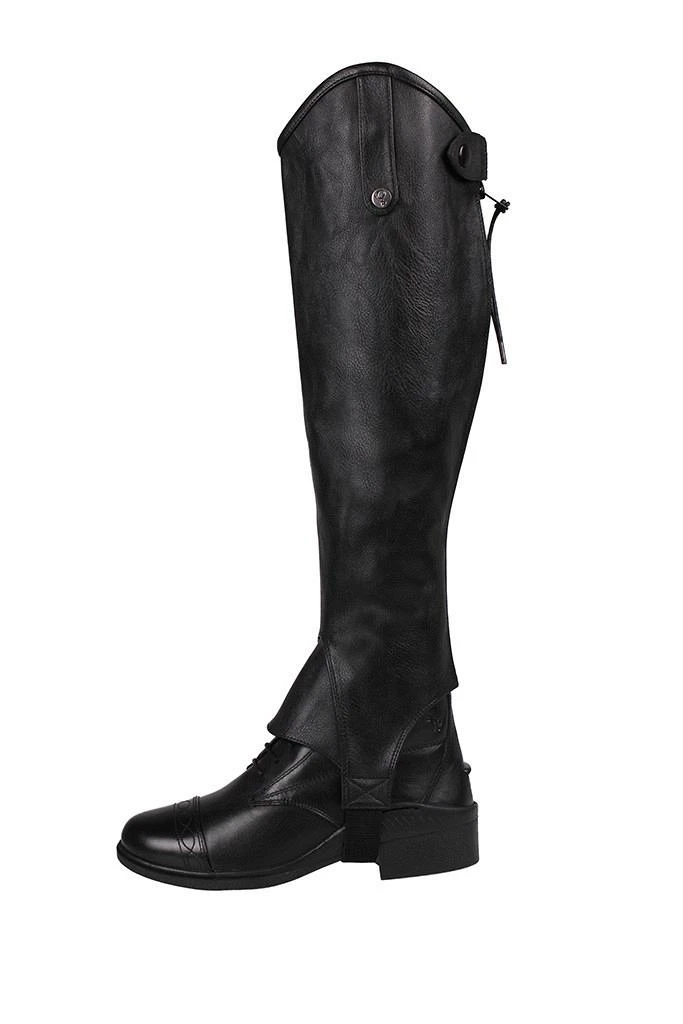 De QHP Birgit N minichap heeft een stoere uitstraling dankzij de grove structuur van het materiaal op de schacht en het vetertje aan de rits. De buitenkant is van elastisch imitatieleder, met rundleder aan de kant tegen het paard.