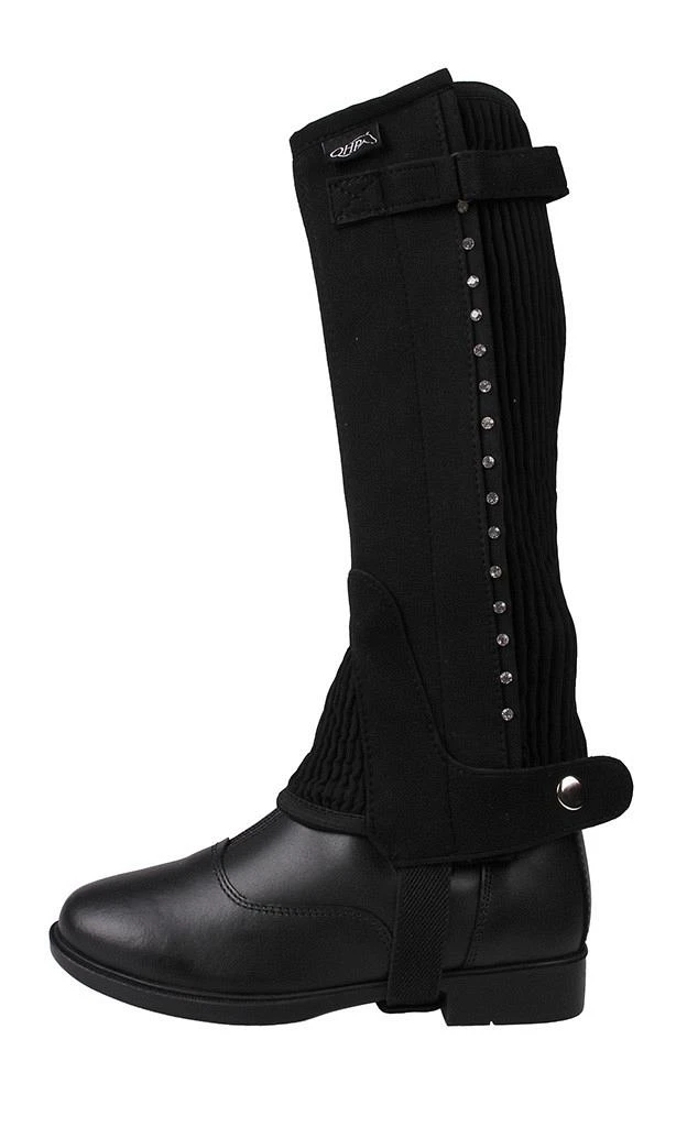 De minichap van imitatiesuède zorgt voor een goede grip tegen het paard en het zadel. De chap heeft aan de achterzijde een breed elastiek voor een goede pasvorm.