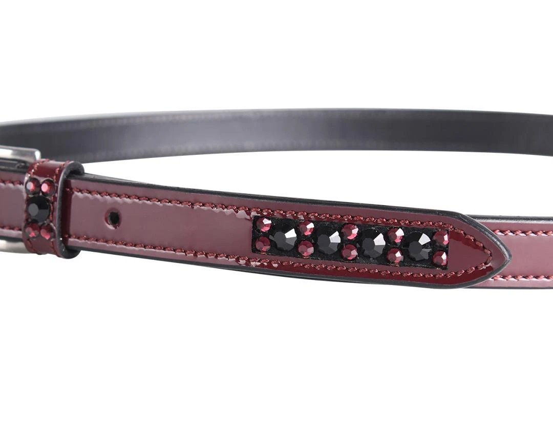 Maak je outfit compleet met deze bordeauxrode lakleren QHP ceintuur Chianti. Zowel het uiteinde van de riem als de passant zijn gedecoreerd met Stellux steentjes in de kleuren zwart en bordeaux die extra licht reflecteren en daardoor prachtig schitteren.