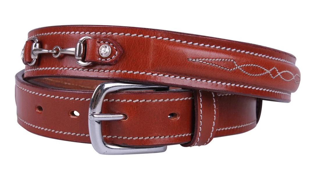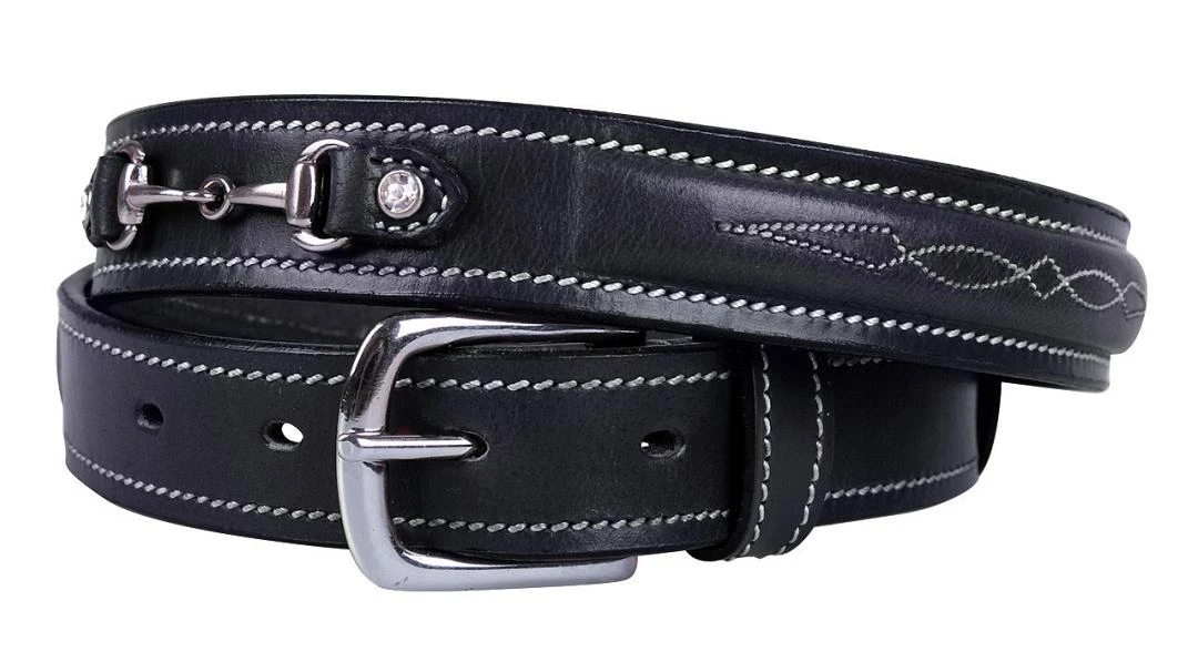 De QHP ceintuur Ricki is versiert met twee bitjes en strass stenen op de leren bevestigingen. De leren riem is afgewerkt met wit sierstiksel en voorzien van een RVS gesp.