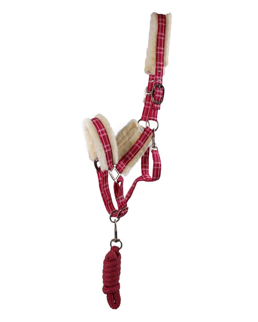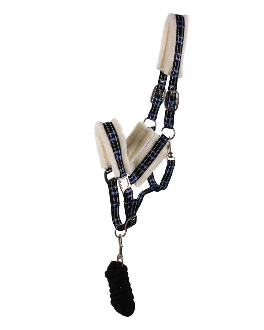 Je paard zal de QHP halsterset bont wel waarderen. Het is bij het kopstuk, de neusriem en bakstukken onderlegd met imitatiewol. Voorzien van een leuk ruitpatroon, gesatineerde fournituren. Wordt geleverd met een bijpassend halstertouw.