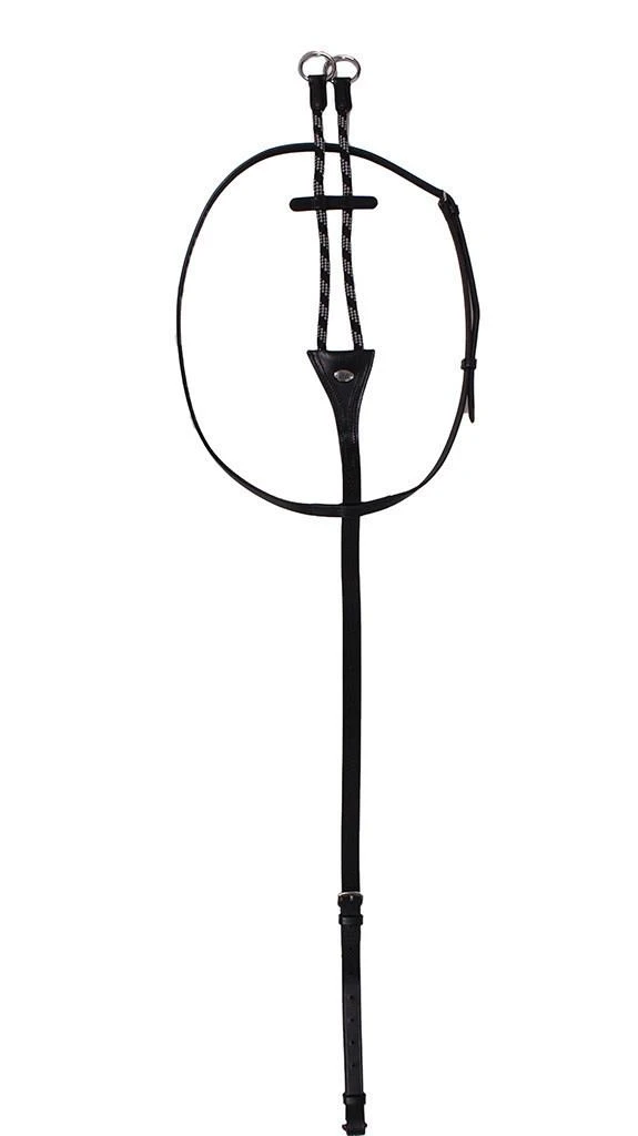 Leren martingaal afgewerkt met tweekleurig koord. Met leren stopper tussen de koorden en op twee plaatsen verstelbaar.