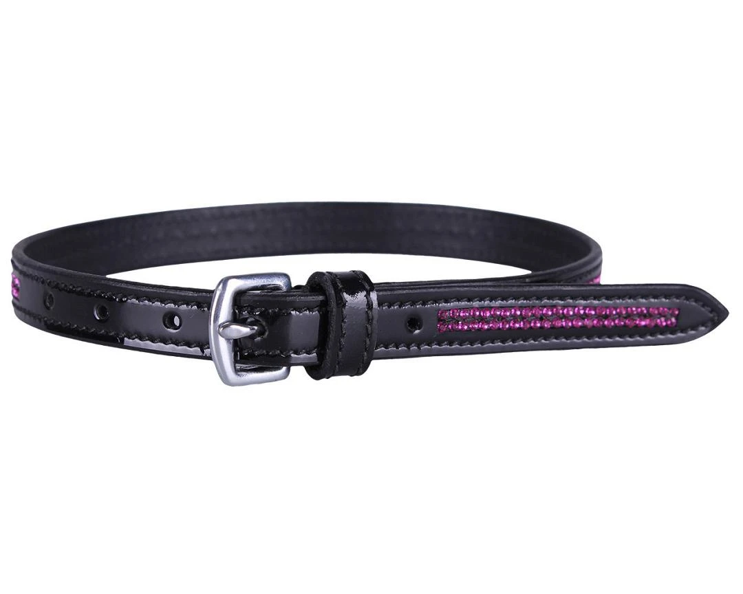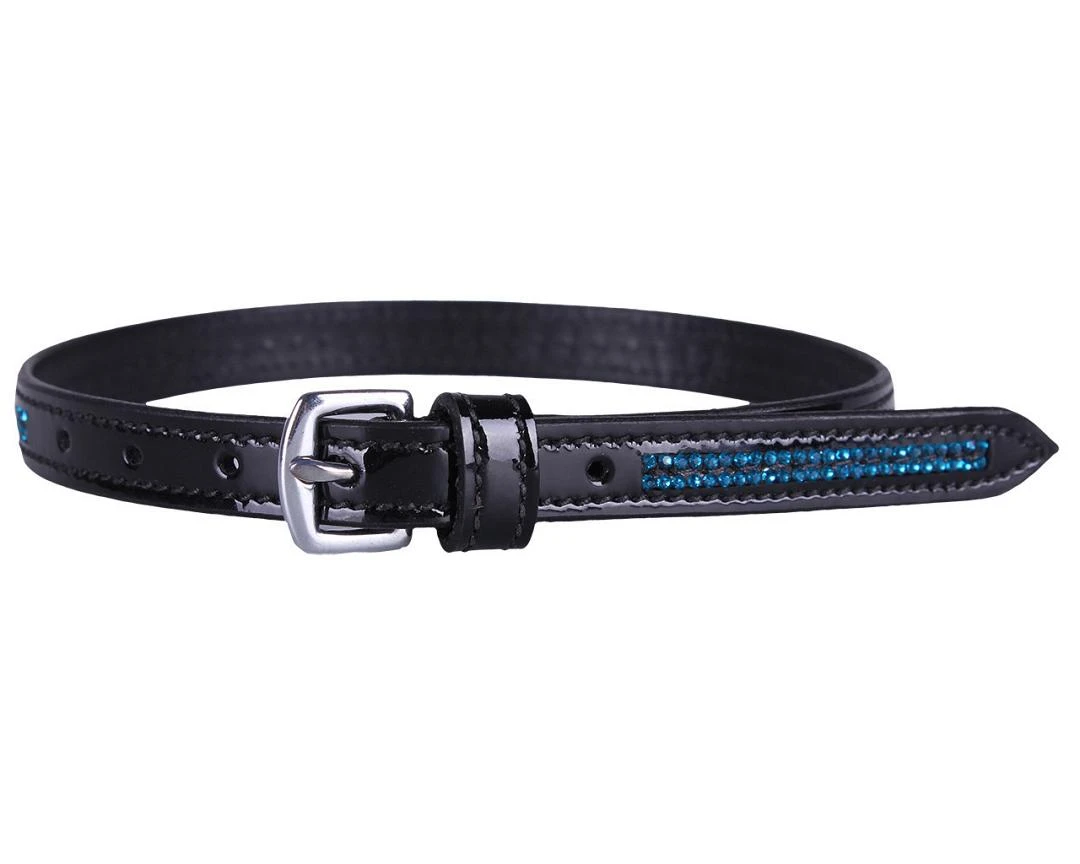 De QHP sporenriempjes Las Vegas zijn zwarte lakleren sporenriempjes met twee rijen strass steentjes en een zilverkleurige RVS gesp.
