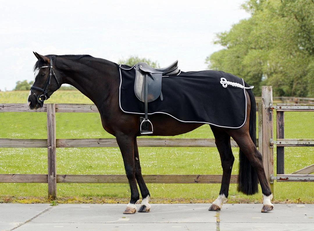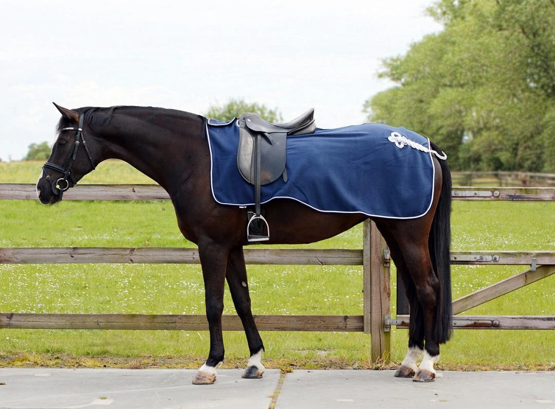 Deze QHP uitrijdeken is te gebruiken tijdens het loswerken en uitstappen om te voorkomen dat het paard te snel afkoelt. Het zilveren sierkoord en ornament op de achterkant geeft deze deken een chique uitstraling. De deken is uitgevoerd met een klittenbandsluiting op de schoft.