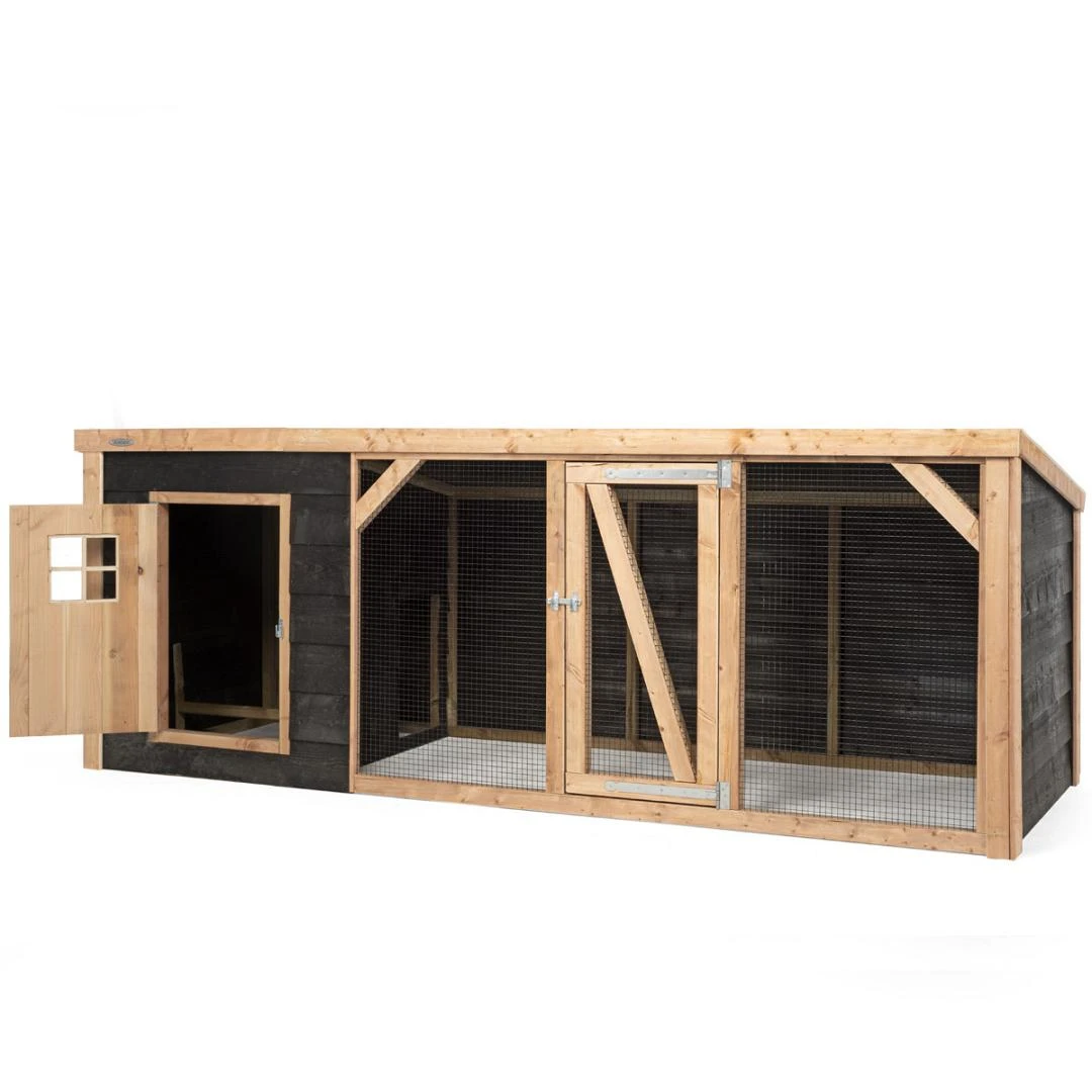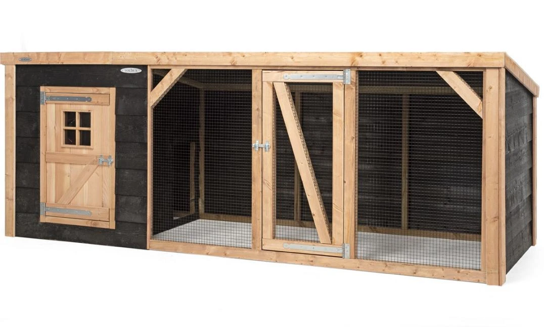 Deze behandelde materialen zijn ideaal voor buitengebruik en vragen hierbij geen jaarlijkse schilder- of beitsbeurt. Het hok is afgewerkt met zwart gaas, wat het verblijf een stijlvol totaalplaatje geeft. Het verblijf bestaat uit een rengedeelte én een ruim opgezet nachthok, voorzien van een legnest en een zitstok voor de nacht. Het nachthok beschikt over een toegangsdeur zodat je zelf goed bij de kippen of konijnen kunt komen én een vrije doorloop hebt voor de dieren vanuit het nachthok naar de ren.