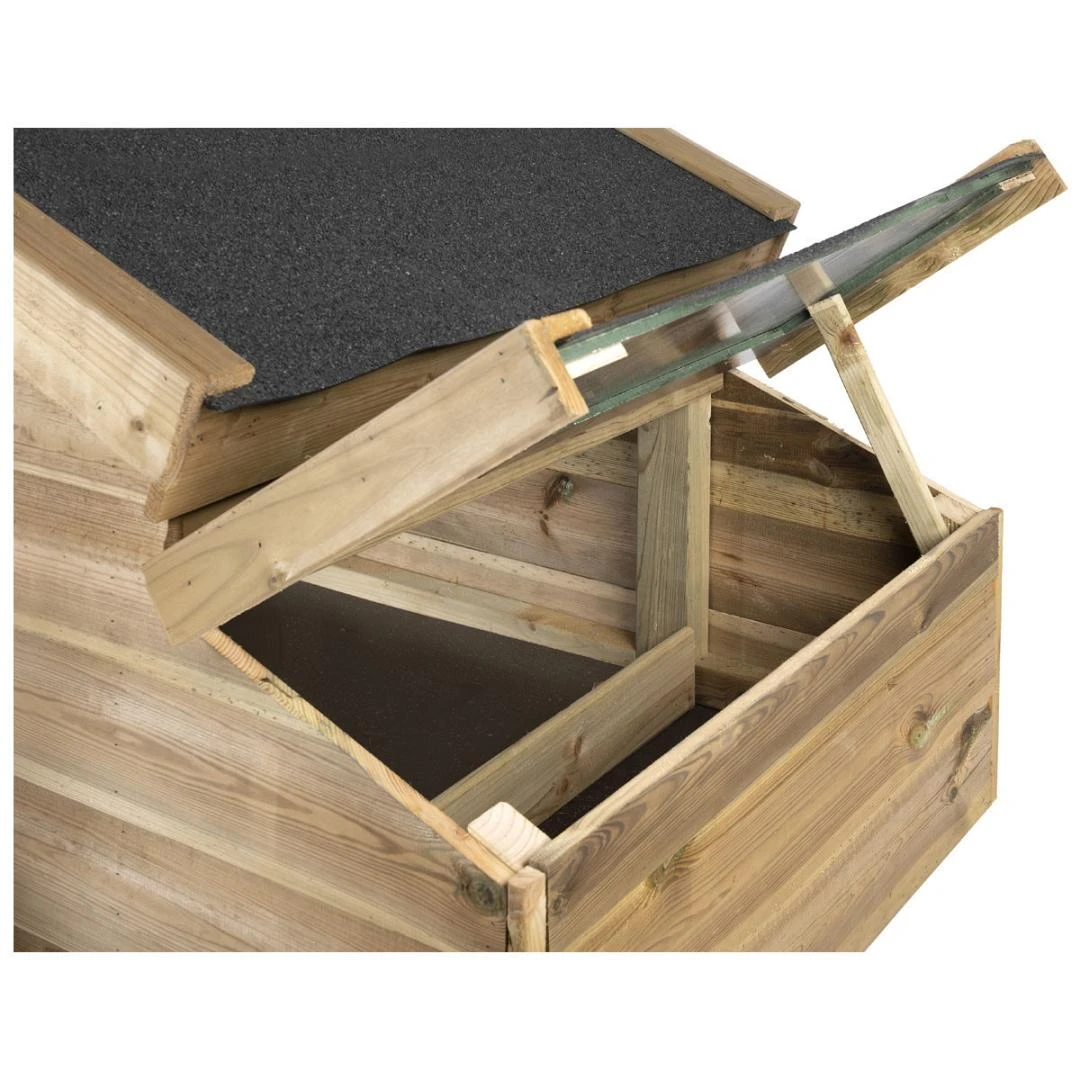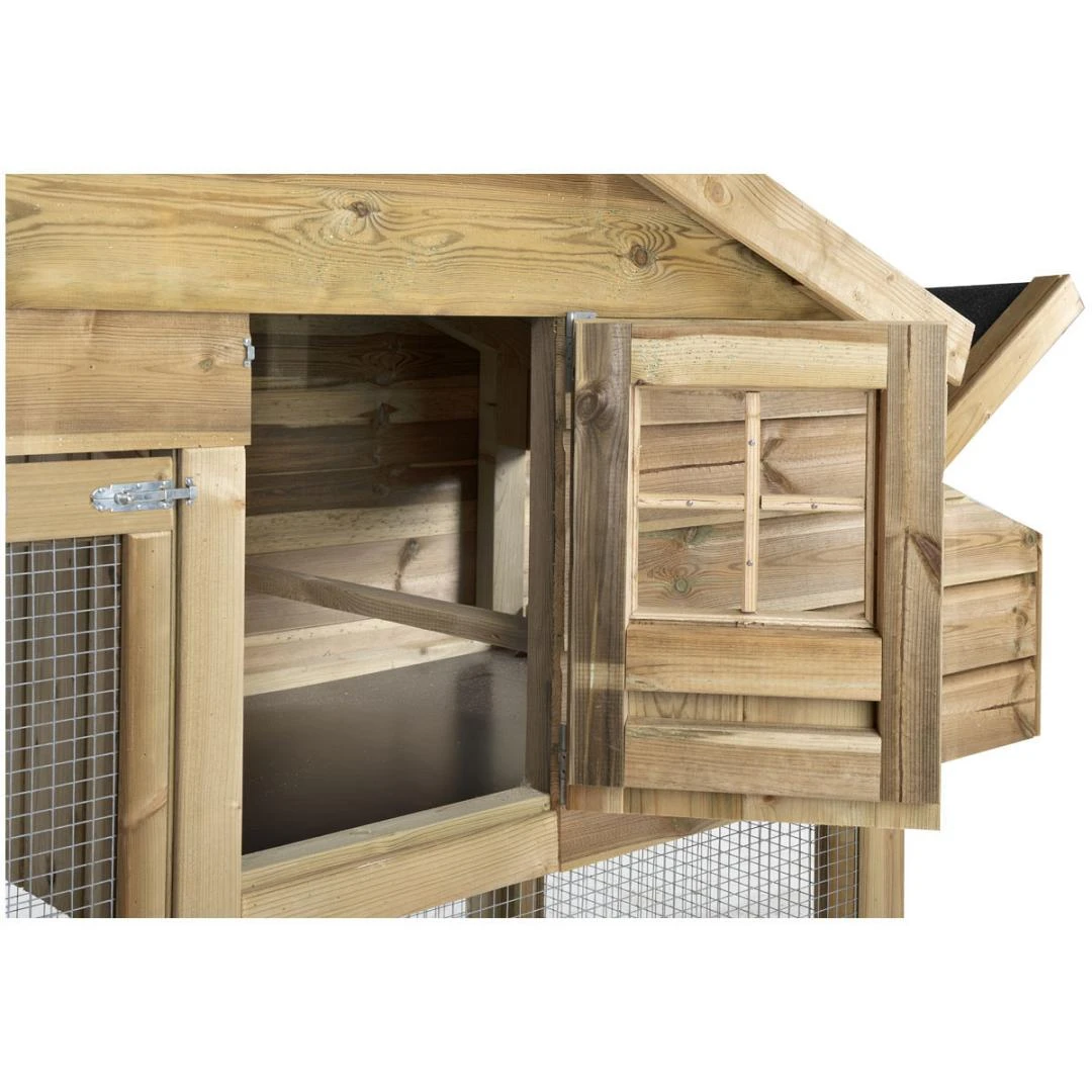 Het hok is voorzien van een binnen verblijf. Door middel van een deur is dit verblijf goed te bereiken. Aan het binnen verblijf bevindt zich een legnest. Het dak is te openen waardoor de eieren gemakkelijk te pakken zijn.